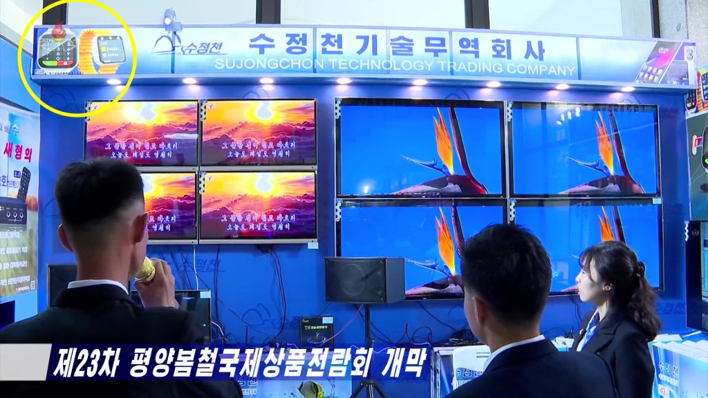 The Sujongchon smartwatch is advertised on the company’s booth at the Pyongyang Spring International Trade Fair (Photo: KCTV)